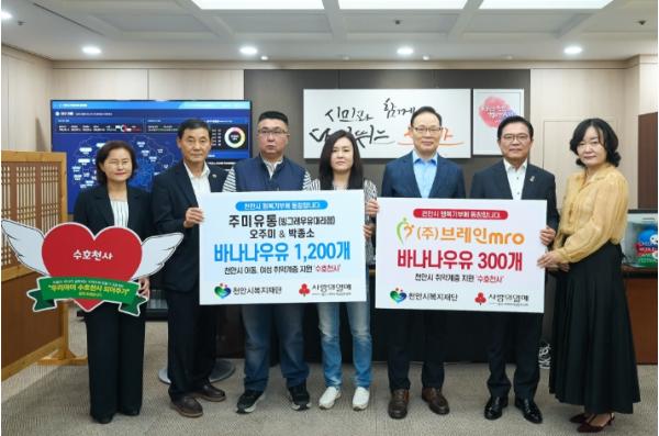 천안시는 주미유통(대표 오주미·박종소)과 브레인MRO(대표 김효열)가 우유 1,500개(270만 원 상당)를 천안시복지재단에 전달했다고 17일 밝혔다.