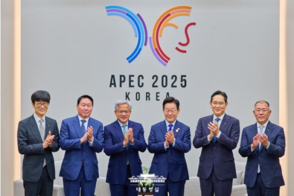 이재명 대통령은 10월 31일 오후 2시 경주 APEC 정상회의를 계기로 방한한 젠슨 황 엔비디아 대표를 만나, 대한민국 AI 인프라를 비롯한 생태계 전반의 혁신 방안에 대해 의견을 교환했다. 이 자리에는 삼성전자 이재용 회장, SK 최태원 회장, 현대차그룹 정의선 회장, 네이버 이해진 의장이 함께했다.