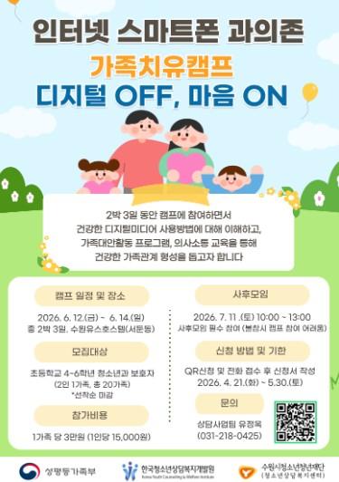 수원시청소년청년재단 소속 수원시청소년상담복지센터는 여성가족부가 주최하고 한국청소년상담복지개발원이 주관하는 2026년 인터넷·스마트폰 가족치유캠프의 운영기관으로 선정되어 오는 6월 12일부터 14일까지 2박 3일 동안 수원 유스호스텔에서 열릴 예정이다.