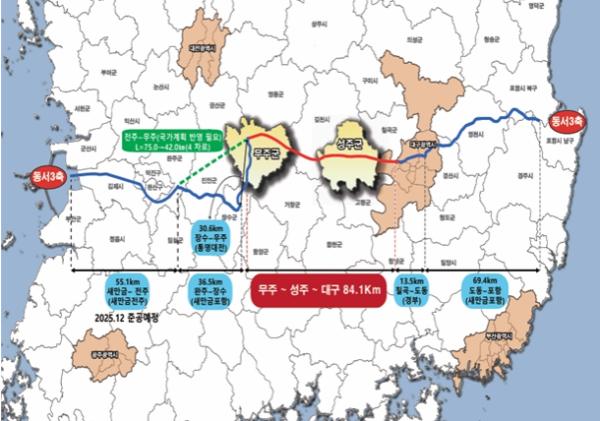 ‘무주~성주~대구 고속도로 건설사업’이 ‘예비타당성조사 대상 사업’으로 최종 선정됐다. 무주~성주~대구 고속도로 건설사업의 예비타당성조사 대상 사업 선정을 위해 무주군은 그동안 기획재정부, 국토