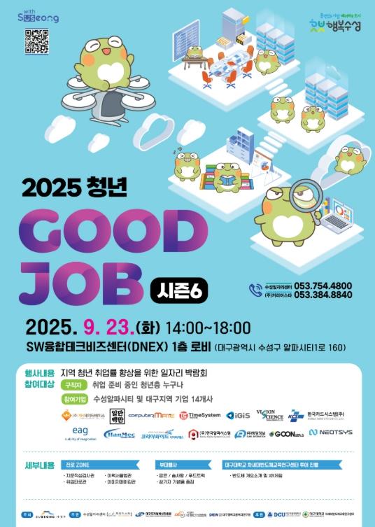 대구 수성구는 오는 23일 수성알파시티 SW융합테크비즈센터에서 지역 청년 구직자의 고용 촉진과 수성알파시티 활성화를 위해 ‘2025 청년 굿잡(GOOD JOB) 일자리 박람회 시즌6’를 개최한다.올해로 6회째를