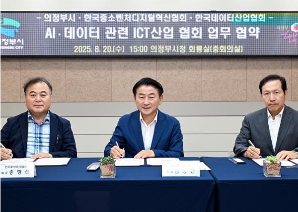 의정부시는 8월 20일 시청 회룡홀에서 한국중소벤처디지털혁신협회(회장 이영상), 한국데이터산업협회(회장 송병선)와 ‘데이터‧AI 기반 디지털 혁신산업 육성 및 기업 유치를 위한 업무협약’을 체결했다.