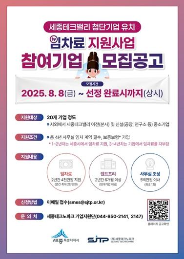 세종시가 세종테크밸리로 이전하는 첨단산업 기업에게 최대 4,500만 원의 임차료와 공사비를 지원한다.세종특별자치시와 세종테크노파크는 ‘첨단기업 유치 임차료 지원사업’ 희망 기업을 모집한다고 10일