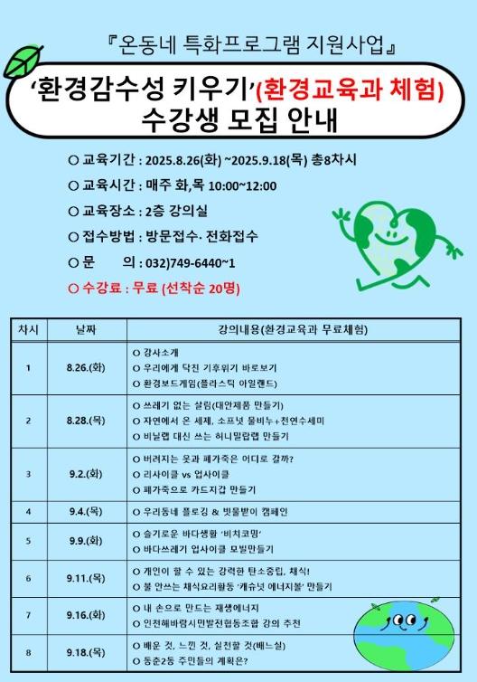 연수구 동춘2동, ‘환경 감수성 키우기’ 프로그램 수강생 모집