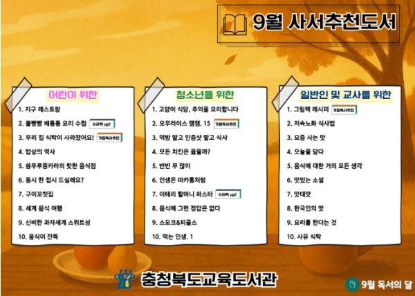 충청북도교육청 직속기관 교육도서관은 '읽고, 맛보고, 즐기자!(음식)'를 주제로 2025년 언제나 책봄 열두달 북큐레이션 9월 사서추천도서 30권을 선정했다고 밝혔다.이번 주제는 음식을 키워드로, 책 속 이