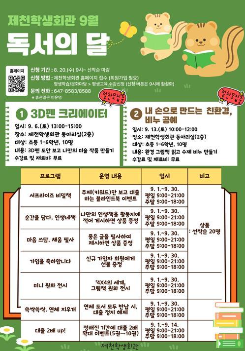 제천학생회관은 독서의 달(9월)을 맞아 ‘읽기 예보: 오늘 읽음, 내일 맑음’이라는 주제로 시민 누구나 즐길 수 있는 풍성한 독서 문화 프로그램을 운영한다. 이번 독서의 달 행사는 도서관 이용을 활성
