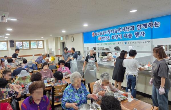 충북교육청사랑나눔봉사단이 9일, 청주 신봉동에 위치한 청주종합사회복지관 구내식당에서‘사랑의 갈비탕 점심 나눔’행사를 진행했다.이번 행사는 평일 복지관에서 점심을 드시는 어르신들 120여 명을 대