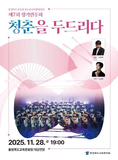 충청북도교육청 직속기관 교육문화원(원장 서종덕)은 28일 저녁 7시, 충북교육청 청소년국악관현악단이 교육문화원 대공연장에서 제7회 정기연주회 '청춘을 두드리다'를 열었다고 밝혔다.올해 정기연주회는