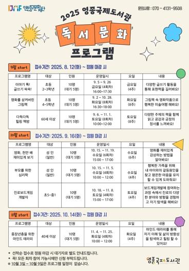 (재)인천중구문화재단 영종국제도서관은 올해 9월부터 11월까지 초등학생부터 60세 이상 어르신까지 전 연령을 대상으로 ‘독서 문화 프로그램’을 운영한다고 18일 밝혔다.이번 프로그램은 글쓰기·그림책
