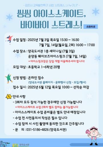 김포시 양곡도서관은 ‘정신적 건강’을 주제로 하여 학업, 교우관계 등 다양한 스트레스를 받고 있는 학생들에게 해소하는 방법을 쉽고 재미있게 알려주고자 ‘씽씽 아이스스케이트, 바이바이 스트레스’를