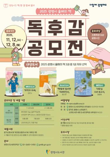 광명시가 시민의 일상 속 책 읽기 문화를 넓히기 위해 ‘2025 광명시 올해의 책 독후감 공모전’을 개최한다고 1일 밝혔다.공모전은 광명시 대표 독서 캠페인 ‘광명시민 책 한 권 함께 읽기’와 연계해 추