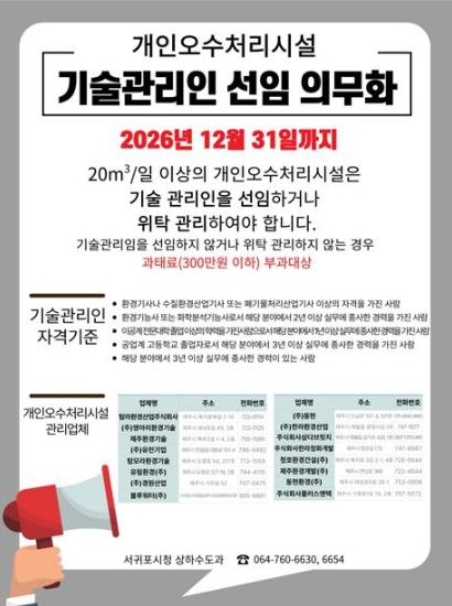 서귀포시는 기술관리인 선임 대상이 되는 개인오수처리시설 기준이 현행 50톤 이상에서 2027년 1월부터 20톤 이상으로 확대됨에 따라, 오는 11월까지 20톤 이상 50톤 미만의 개인오수처리시설 180개소를 대
