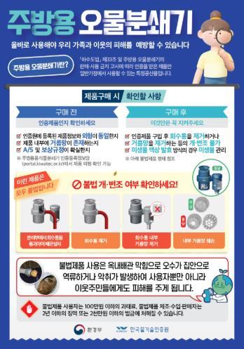 울진군은 올바른 주방용 오물분쇄기 사용방법, 불법 제품 근절 등 올바른 하수 배출 안내를 위해 적극적인 홍보에 나섰다. 주방용 오물분쇄기는 하수도법에 따라 한국물기술인증원에서 인증을 받은 제품만