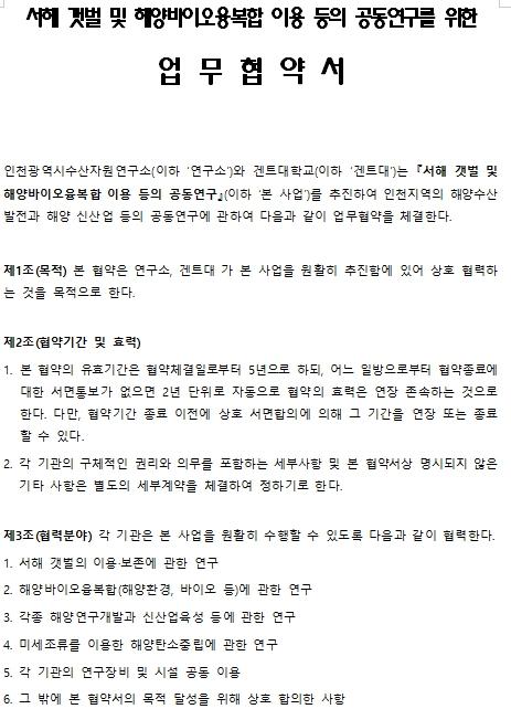 인천광역시 수산자원연구소는 6월 17일 인천 지역 외국계 대학인 겐트대학교(Ghent University)와 해양수산 공동연구 협력을 위한 업무협약을 체결했다고 밝혔다.이번 협약은 인천지역 해양수산 발전과 해양