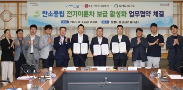 포항시가 전기이륜차 보급과 충전 인프라 확충으로 도시의 탄소배출 저감과 친환경 산업 기반 구축에 본격적으로 나선다. 포항시는 17일 시청 중회의실에서 ㈜LG에너지솔루션(대표 김동명), ㈜큐모터스(대