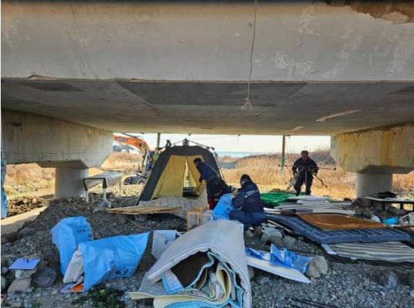 울산 북구는 지난 16일 어물동 1240-148번지 일원 금천교 하부 불법시설물에 대한 행정대집행을 실시했다고 17일 밝혔다. 이날 북구청 건설과 직원 12명과 굴삭기가 투입돼 텐트와 의자, 테이블 등 불법시설