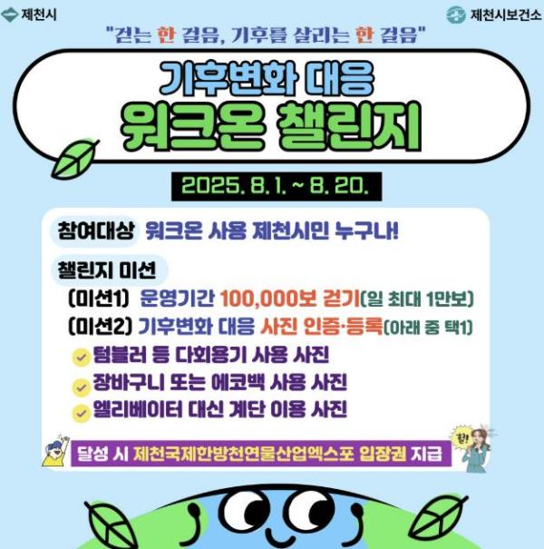 제천시보건소가 시민의 건강 증진과 기후 변화 대응 인식 확산을 위해 오는 8월 1일부터 20일까지 ‘기후변화 대응 워크온(걷기) 챌린지’를 운영하다고 밝혔다.이번 챌린지는 모바일 걷기 앱 ‘워크온(Walk