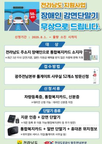 전라남도는 장애인의 안전하고 편안한 고속도로 이용을 위해 한국도로공사 광주전남본부와 함께 1천400대의 ‘장애인용 하이패스 단말기’를 무상 지원한다고 밝혔다.올해는 더 많은 장애인에게 혜택이 돌아