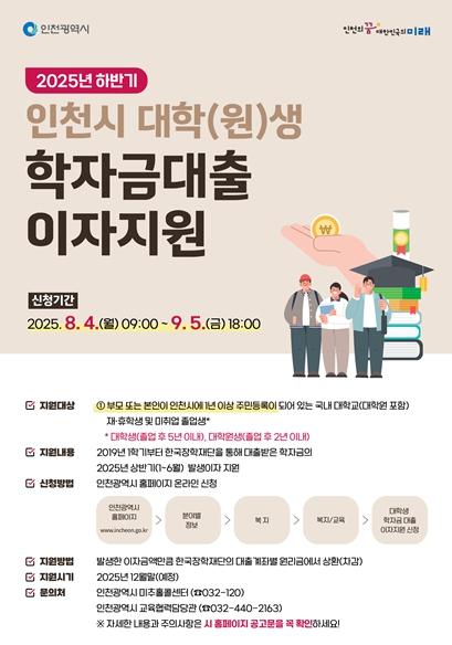 인천광역시는 대학(원)생들의 학자금대출 부담을 줄이기 위해 2025년 하반기 학자금대출 이자 지원신청을 오는 8월 4일부터 접수한다고 밝혔다.학자금대출 이자 지원사업은 대학(원)생과 취업 준비생의 경제