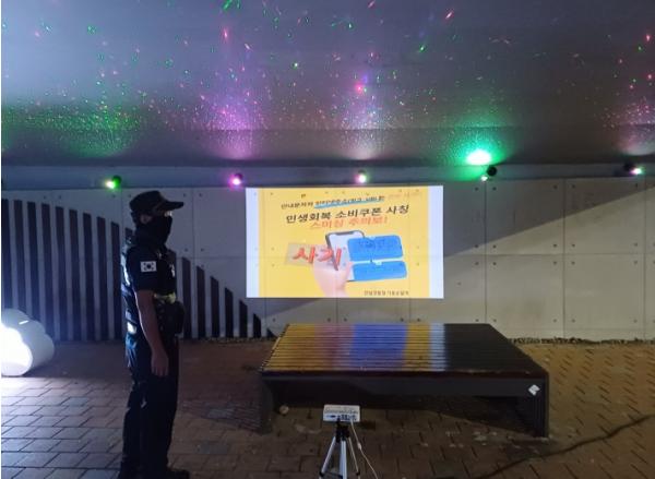 전남경찰청 기동순찰대(대장 박현용)가 일몰 후, 빔 프로젝터를 이용해 △공원·산책로 △상업지구 등 사람들의 이동이 많은 보행로나 외벽에 범죄예방 영상을 홍보해 지역민들에게 큰 호응을 얻고 있다.전남