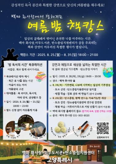 고양특례시는 오는 8월 25일~31일, 매일 저녁 6시부터 9시까지 백마 화사랑에서‘여름밤 책캉스’를 개최한다고 밝혔다.