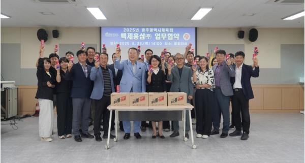 시체육회는 28일 오후 2시 체육회관 중회의실에서 전갑수 체육회장, 이광자 백제홍삼 전무이사 등 관계자 10명이 참석한 가운데 ‘광주시체육회-백제홍삼(주) 업무협약식’을 가졌다고 밝혔다.