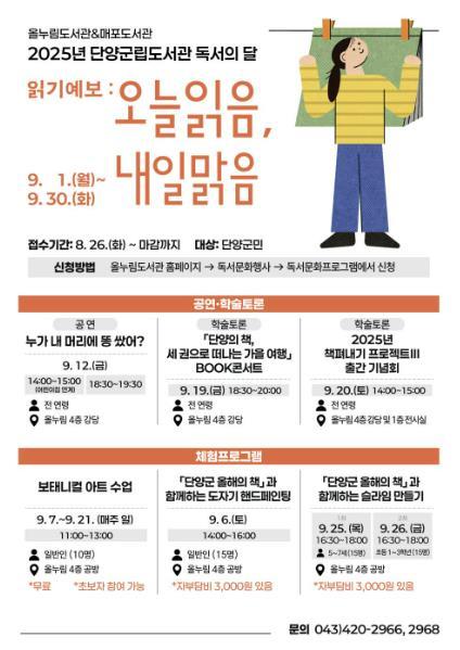 군립도서관은 ▲9월 12일 뮤지컬 '누가 내 머리에 똥 쌌어?' ▲9월 19일 '단양의 책, 세 권으로 떠나는 가을여행' BOOK 콘서트 ▲9월 20일 '2025년 책펴내기 프로젝트Ⅲ' 출간 기념 및 전시회를 비롯해 ▲9월 6일 도자기 핸드페인팅 ▲9월 7∼21일 보태니컬 아트 수업 ▲9월 25∼26일 슬라임 만들기 등 풍성한 프로그램을 준비했다.
