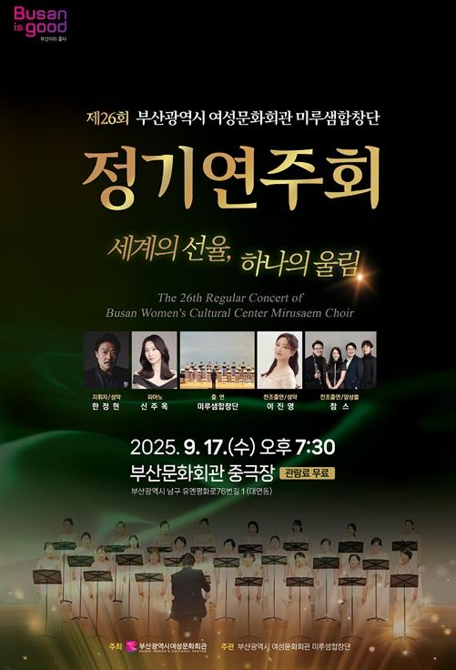 부산시 여성문화회관은 오는 9월 17일 오후 7시 30분 부산문화회관 중극장에서 '제26회 미루샘합창단 정기연주회'를 개최한다고 밝혔다.