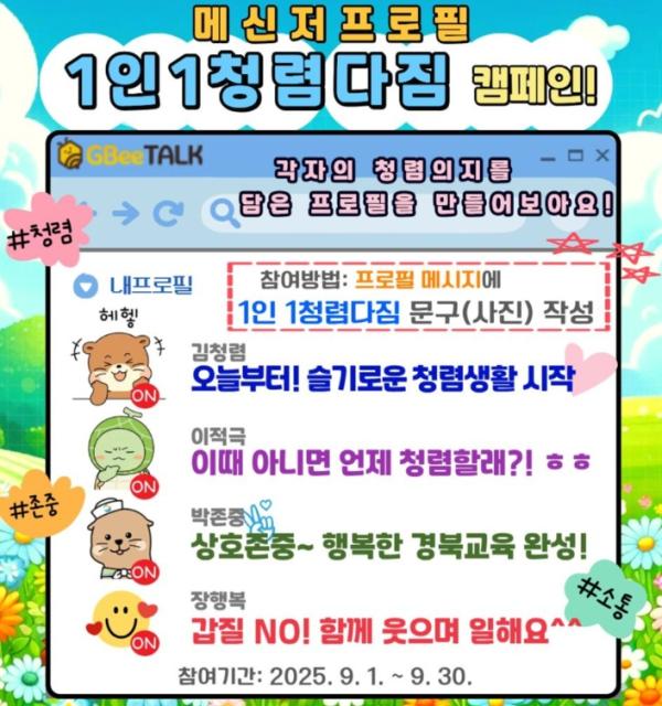 경북교육청은 9월 한달 간 쉽고 즐겁게 참여할 수 있는 ‘메신저 프로필 '1인·1청렴다짐' 캠페인’을 실시한다고 8일 밝혔다.