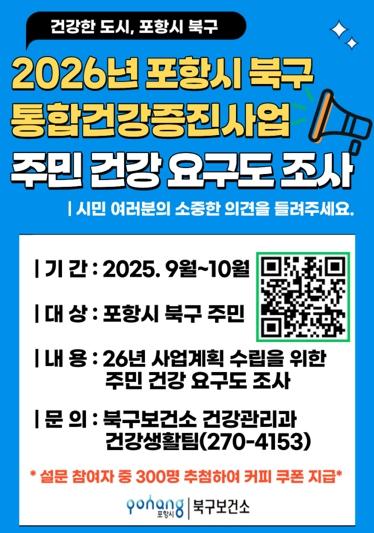 설문은 ▲지역사회 건강문제 ▲보건소 건강증진사업 참여도 및 인식도 ▲우선 추진이 필요한 건강증진사업 ▲보건사업 대상 선정 우선순위 등 총 12문항으로 구성되며, 포항시 및 남·북구보건소 홈페이지에 게시된 QR코드를 통해 온라인으로 참여할 수 있다. 응답자 중 300명을 추첨해 모바일 상품권도 지급할 예정이다.