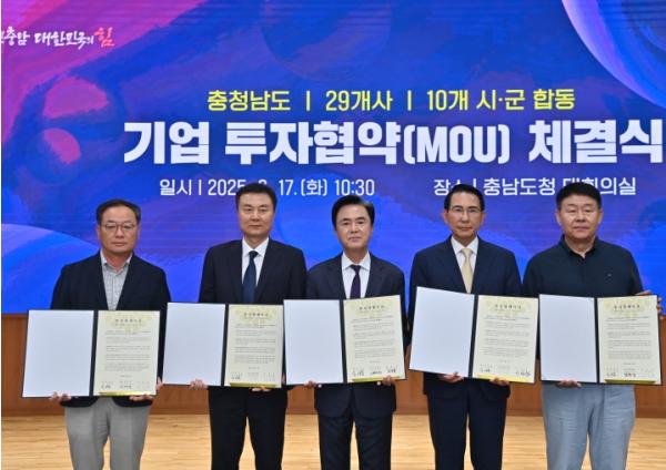 김태흠 지사는 17일 도청 대회의실에서 김석필 천안시장권한대행 등 10개 시군 단체장 또는 부단체장, 정영웅 두보산업 대표이사 등 29개 기업 대표 등과 투자협약을 체결했다.
