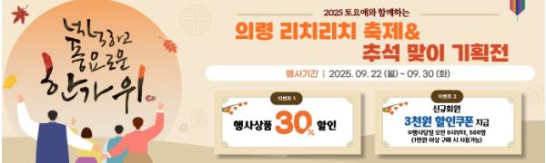 의령군은 오는 22일부터 30일까지 의령군 공식 쇼핑몰 ‘토요애’에서 리치리치페스티벌 및 명절 추석을 맞아 전 행사상품 30% 농·특산물 할인 이벤트를 추진한다고 밝혔다.