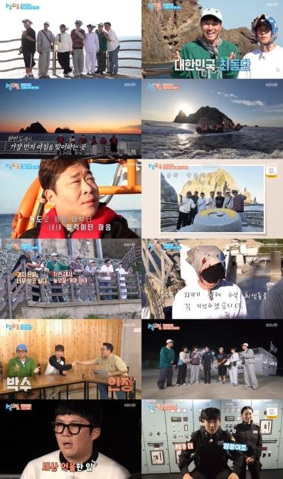 이날 '1박 2일' 팀은 특별 허가를 얻어 독도 공개제한구역에도 발을 내디뎠다. 멤버들은 드넓은 동해가 훤히 내려다 보이는 망양대부터 독도의용수비대의 숨결이 느껴지는 '한국령' 바위, 독도를 지키다 순직한 경찰들을 기리기 위한 위령비를 차례대로 방문했고, 커다란 태극기가 있는 최정상까지 오르며 독도 투어의 대미를 장식했다.