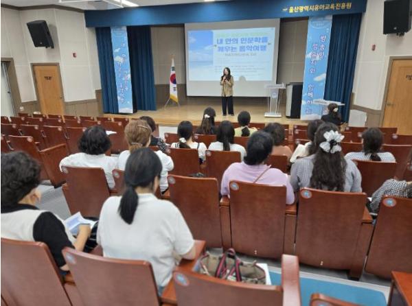 울산유아교육진흥원은 지난 16일 시청각실에서 유치원과 어린이집 교원을 대상으로 ‘방송인 정윤지와 함께하는 내 안의 인문학을 깨우는 음악 여행’을 주제로 치유 연수를 열었다.
