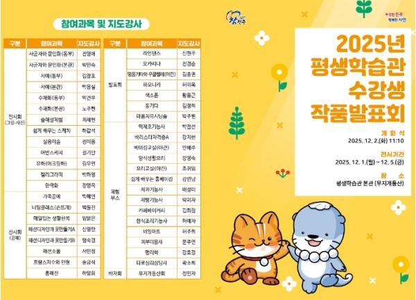 진주시는 12월 1일부터 5일까지 5일간 평생학습관 본관에서 ‘2025년 평생학습관 정기교육 수료식 및 제37회 수강생 작품발표회’를 개최한다고 전했다.