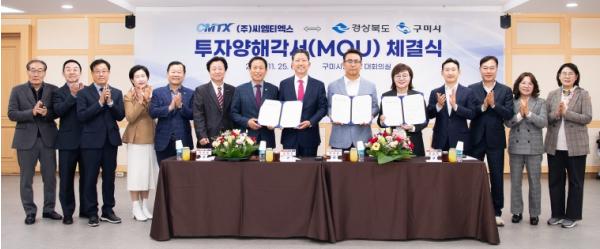 경상북도와 구미시는 25일 구미시청 3층 대회의실에서 양금희 경상북도 경제부지사, 김장호 구미시장, 박교상 구미시의회 의장, 박성훈 ㈜씨엠티엑스 대표이사 등이 참석한 가운데 ㈜씨엠티엑스와 경상북도·구미시 간 투자양해각서(MOU)를 체결했다.