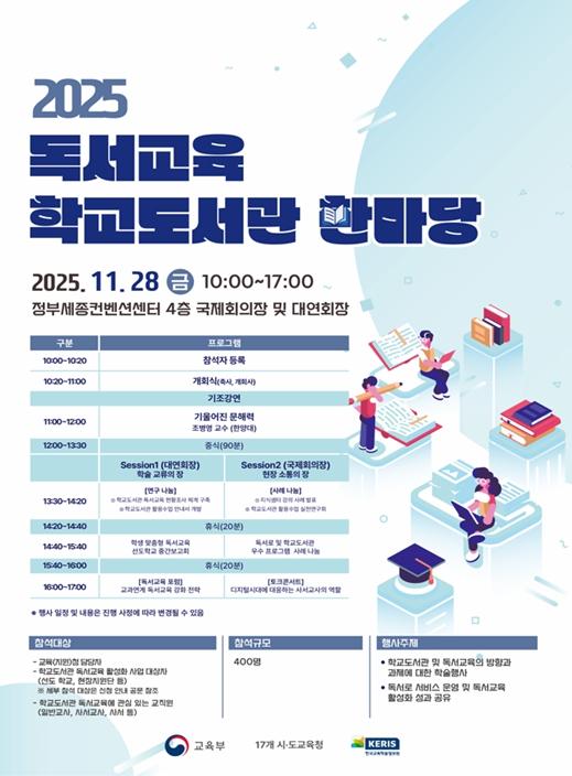 이번 행사는 교사, 학계 전문가 등 독서교육 관계자들이 함께 모여 독서교육과 학교도서관 운영 성과를 공유하고 독서교육의 발전 방향을 모색하는 자리이다.