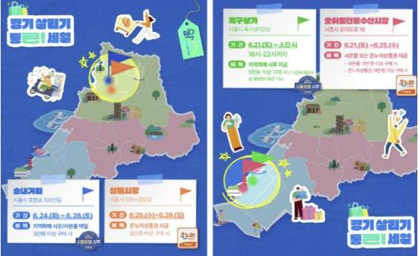 상권별 주요 혜택은 ▲삼미시장(6월 25일~29일) 구매 금액에 따라 온누리상품권 최대 3만원 증정 ▲오이도전통수산시장(6월 21일~6월 25일) 온누리상품권 또는 사은품 증정 ▲옥구상가(6월 21일~소진 시) 시루 최대 2만 원 증정(상인회 지정 매장 이용 시) ▲솔내거리(6월 24일~28일) 시루 또는 사은품 증정 + 3만 원 이상 구매 시 경품 응모 기회 제공 등이다.