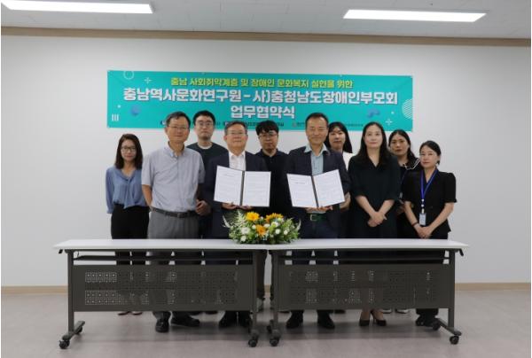 충남역사문화연구원은 19일 사)충청남도장애인부모회와 충남지역 장애인을 비롯한 사회취약계층을 대상으로 역사교육, 문화유산 체험 등 문화복지 서비스 확대를 위한 상호협력 체계를 구축하고 상생 발전을 위한 업무협약을 체결했다고 밝혔다.