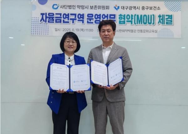 대구 중구보건소는 지난 6월 19일 사단법인 대구약령시보존위원회(이사장 이병식)와 주민의 간접흡연 피해를 예방하고 건강 증진을 도모하기 위한 ‘자율금연구역 운영 업무협약(MOU)’을 체결했다.