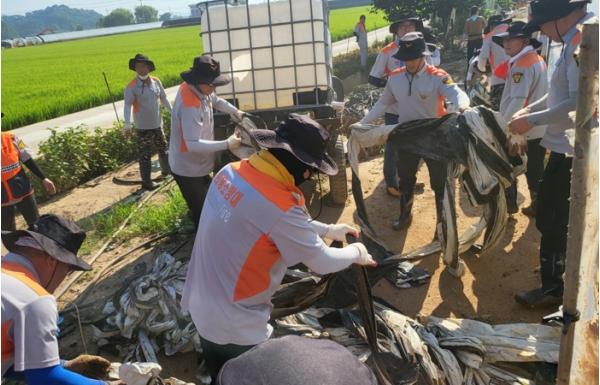 이날 의용소방대 연합 회원들은 침수된 비닐하우스 단지를 중심으로 폐비닐 수거, 멜론 작물 잔해물 처리, 토사 제거 등 집중 복구작업을 벌이며 피해 주민들의 일상 회복을 도왔다.