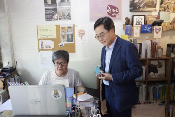 김 지사는 이날 오후 ‘광화문서림’을 찾아 정시영 대표와 인사를 나누고 서점 내부 도서를 둘러본 후 여름 휴가 때 읽겠다며 김훈의 ‘하얼빈’과 셸리 리드의 ‘흐르는 강물처럼’ 등 두 권의 책을 구매했다.