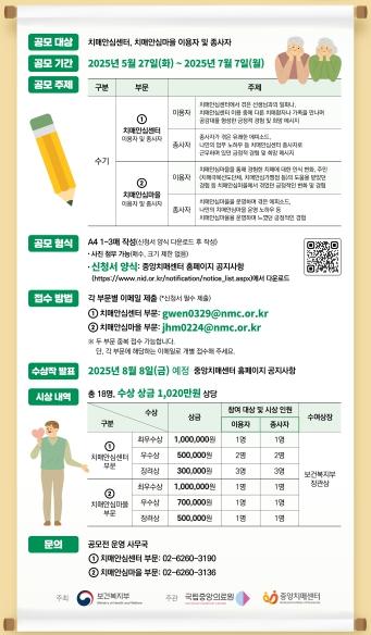 이번 공모전은 ▲치매안심센터 부분과 ▲치매안심마을 부문으로 나누어지며, 이용자 및 종사자가 겪은 유쾌한 에피소드와 긍정적 경험, 희망 메시지로 작성하여 2025년 5월 27일부터 2025년 7월 7일까지 응모하면 된다.