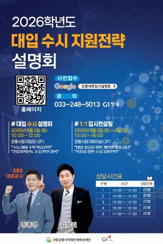 (재)강릉시미래인재육성재단(이사장 김상영)은 오는 8월 2일부터 3일까지 이틀간 시청 2층 대강당과 대회의실에서 2026학년도 대입설명회 및 1:1 맞춤형 진학 컨설팅을 개최한다.