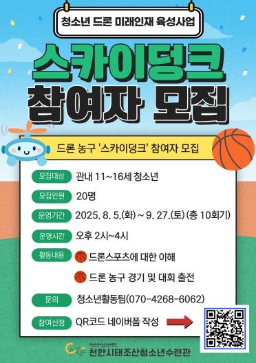 (재)천안시청소년재단 천안시태조산청소년수련관은 드론 농구 프로그램 ‘스카이덩크’를 참가자를 모집한다고 30일 밝혔다.