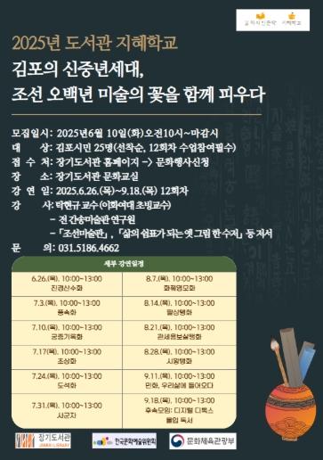 김포시 장기도서관은 2025년 도서관 지혜학교 공모사업에 선정되어 '김포의 신중년세대, 조선 오백년 미술의 꽃을 함께 피우다'를 6월 26일부터 9월 18일까지 진행한다.