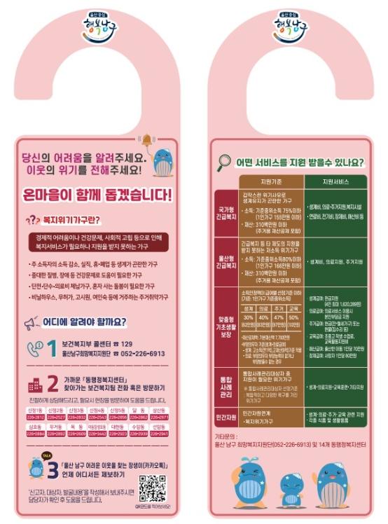 울산 남구는 오는 9월 12일까지 여름철 폭염과 경기침체 등으로 어려움을 겪는 주민을 대상으로 ‘2025년 4차 복지사각지대 기획발굴’을 추진한다고 밝혔다.
