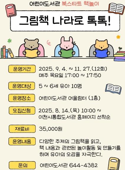 이천시 어린이도서관이 다음 달 4일부터 5세~6세 유아를 대상으로 북스타트 책놀이 ‘그림책 나라로 톡톡!’ 프로그램을 운영한다.